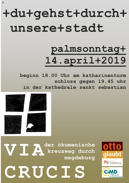 Am Palmsonntag, dem 14. April, gehen Christen vieler Magdeburger Gemeinden wieder den schon traditionellen ökumenischen Kreuzweg durch die Stadt. Die christlichen Gymnasien, das Ökumenische Domgymnasium und das katholische Norbertus-Gymnasium, beteiligen sich wie immer und haben wieder gemeinsam eine Station übernommen. Der Weg beginnt um 18 Uhr am Katharinenturm, wo die Katharinenkirche stand. Weitere Stationen sind der Alte Markt, der Prämonstratenserberg und das Hundertwasserhaus. Der Kreuzweg endet in der Kathedrale St. Sebastian. Passionstexte aus dem Johannesevangelium sollen an das Leiden Jesu erinnern, in Meditationen werden bei den einzelnen Stationen Leid und Schuld heute und aus der Geschichte bedacht. Dazwischen tragen die Gruppen ein großes Holzkreuz und Kerzen durch die Straßen. Begleitet wird der Zug von zwei Posaunenchören. Zur Teilnahme ist jeder eingeladen.