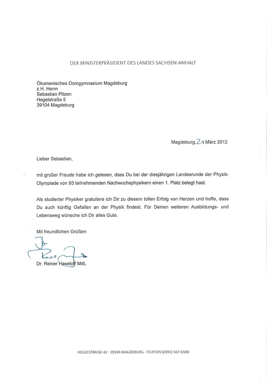 Bei der diesjährigen Landesrunde der Physikolympiade am 15.03.12 errang Sebastian Pitzen (ÖDG, Klasse 8b) einen 1. Preis und hat sich somit für die nächste Stufe, das Auswahlverfahren zur internationalen Physikolympiade, deren Endrunde 2013 in Dänemark stattfinden wird, qualifiziert. Wir gratulieren herzlich zu diesem tollen Erfolg!