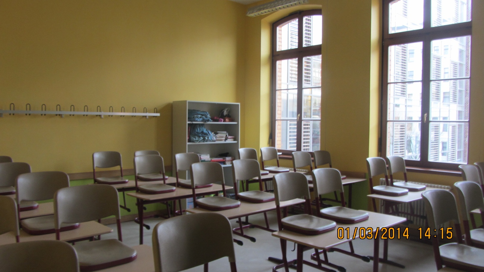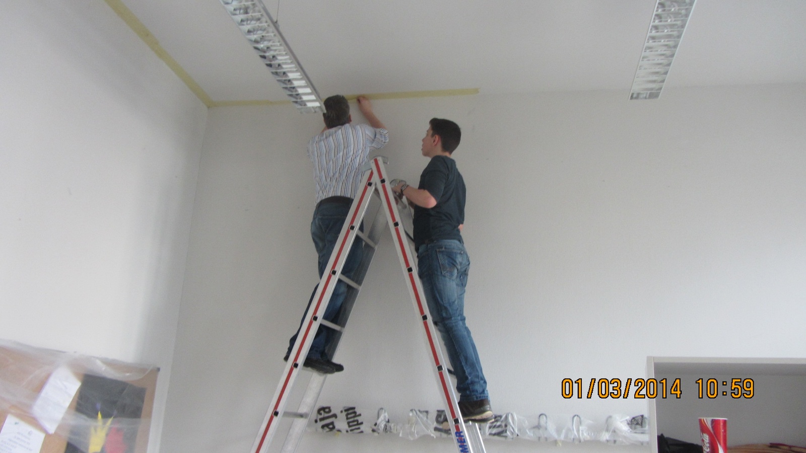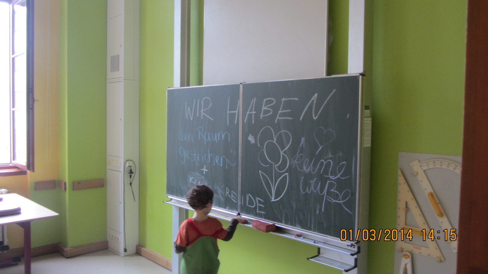 Wir haben das Thema Frühjahrsputz in diesem Jahr sehr ernst genommen, und pünktlich zum meteorologischen Frühlingsbeginn unserem Klassenraum B207 ein frühlingshaftes, frisches Gewand verpasst. 10 Uhr ging es los – das Ausräum- und Abklebteam war pünktlich zur Stelle und klebte eine Stunde lang alles ab, was abzukleben war. Besonders hervorzuheben ist hier Viktors Einsatz, der auf der langen Leiter den oberen Rand der Wände in der gesamten Länge abklebte und so dafür sorgte, dass die Decke beim Streichen der Wände fleckenlosblieb. Zwischen 11 und 13 Uhr war dann das Streichteam gefragt. Einige machten sich mit grün an der Tafelwand zu schaffen, andere strichen den unteren Teil der restlichen Wände gelb und grün und die Eltern übernahmen Feinarbeiten und den schwierigen Anstrich im oberen Teil der Wände.