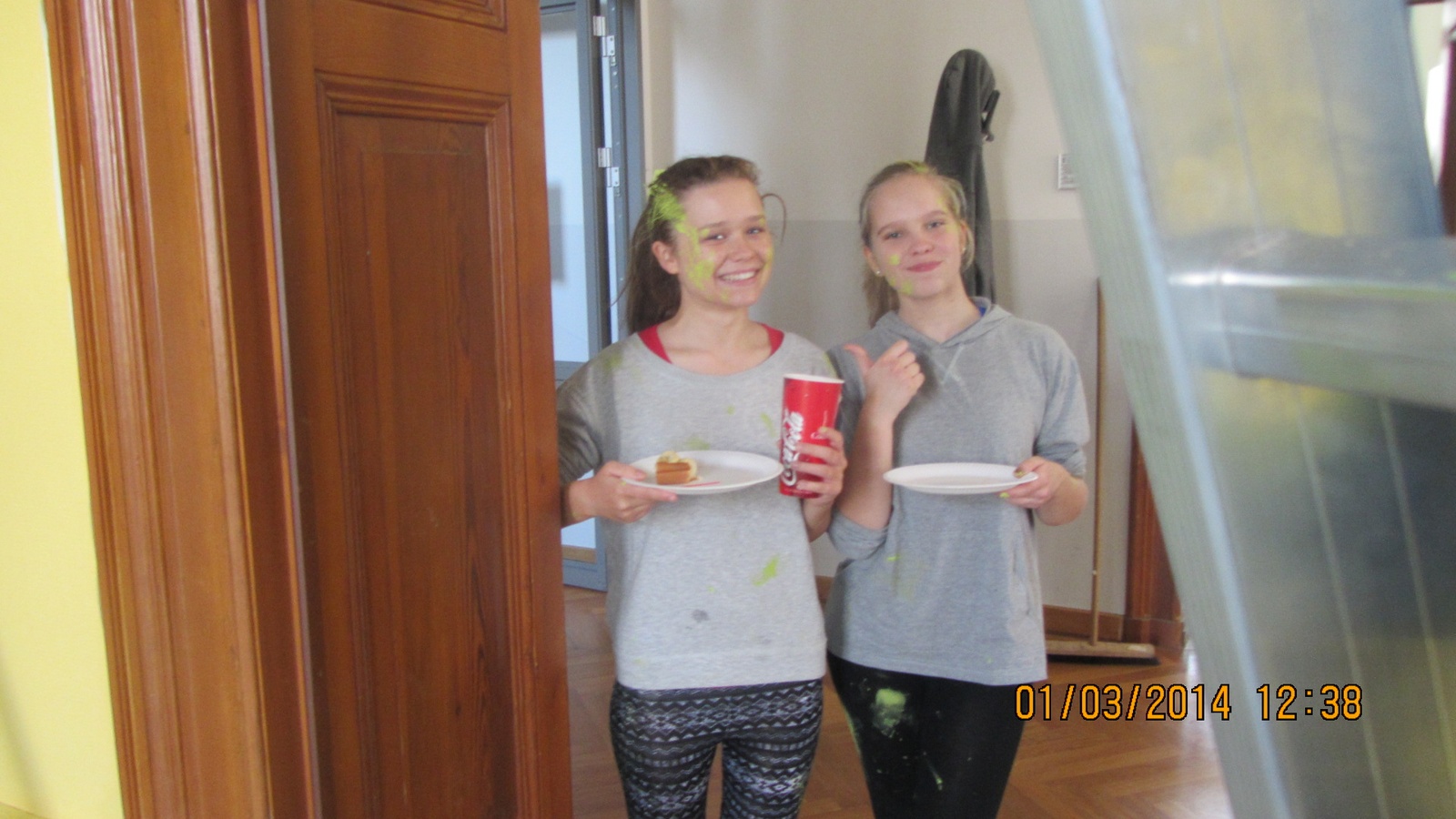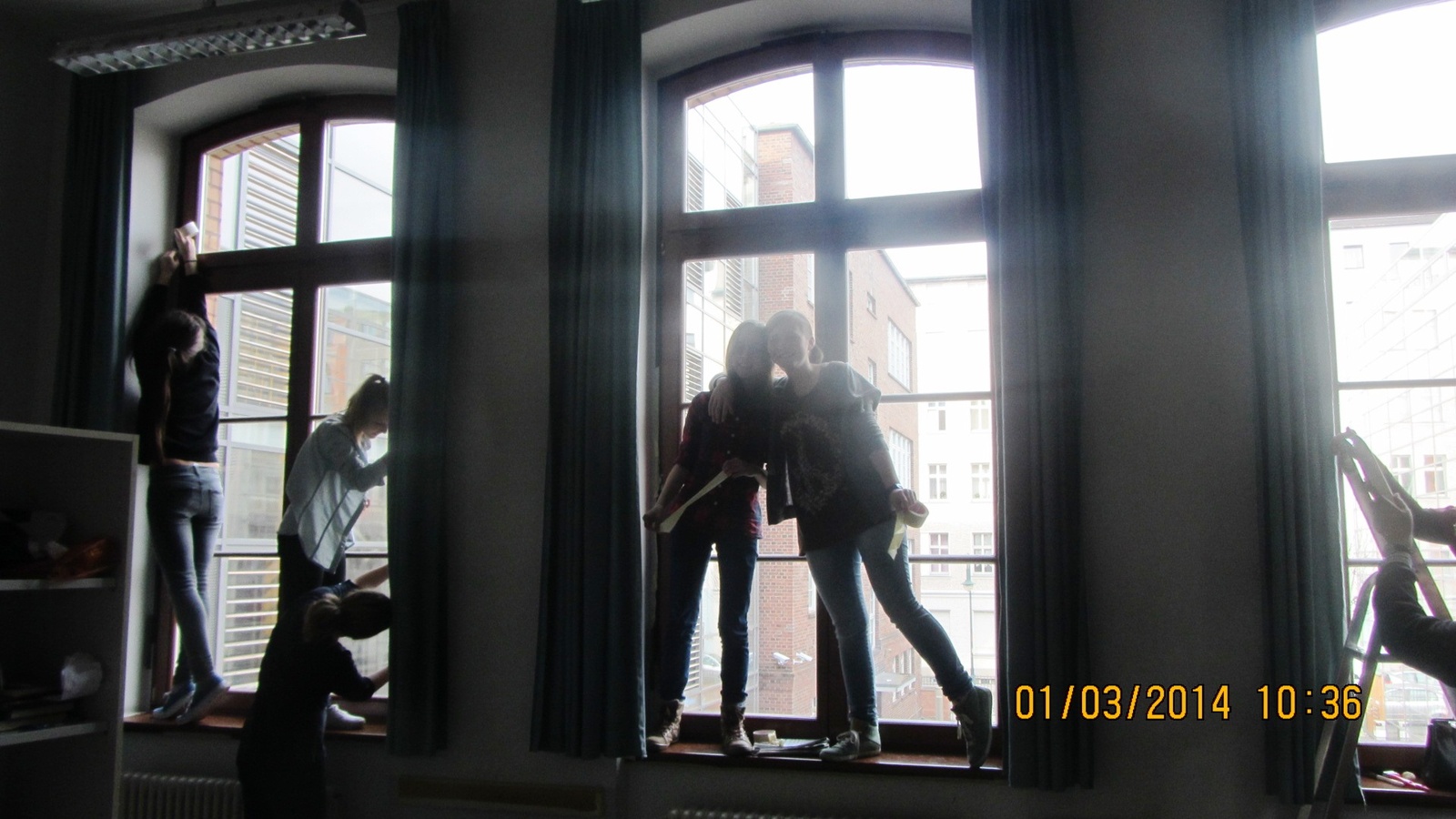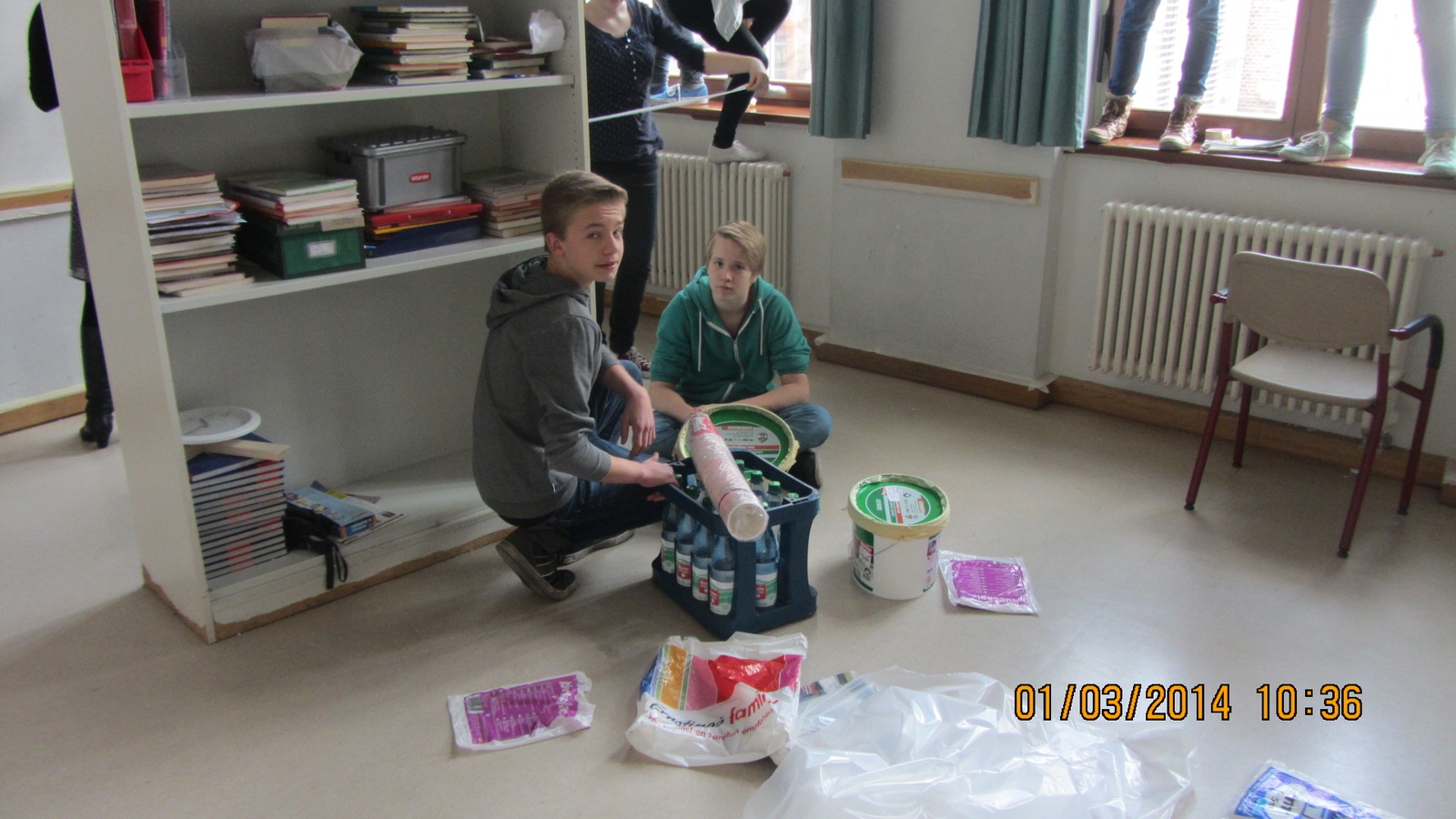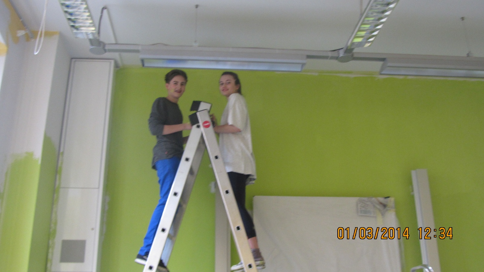 An dieser Stelle ein großes Dankeschön an alle Helfer: an Frau Griesau für das Besorgen der Farben und der Materialien, an Frau Lange, Herrn und Frau Scharrenberg, Herrn und Frau Peter und Herrn Schuschke für die große Hilfe beim Abkleben und Streichen, an Frau Liebig-Pfau und Frau Freudenberg für die Hilfe beim Aufräumen, an Frau Laiter für die leckere Verpflegung, und natürlich an die fleißigen Schüler und Schülerinnen der 8D.