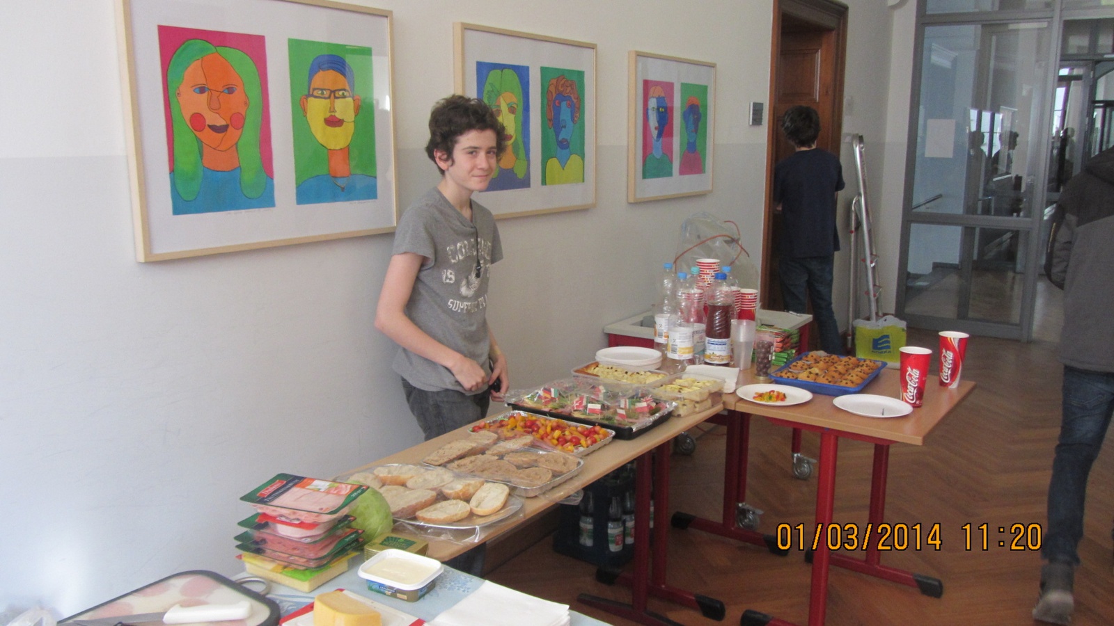 Um 11 kam auch das Verpflegungsteam und baute ein leckeres Buffet für die fleißigen Arbeiter auf. Wie geplant war nach zwei Stunden unser Klassenraum in frische Farben getaucht und unsere Putzkolonne konnte ihres Amtes walten. 14.30 Uhr sah der Raum wieder aus wie ein Klassenraum und alle bestaunten glücklich und zufrieden unser gemeinsames Werk.