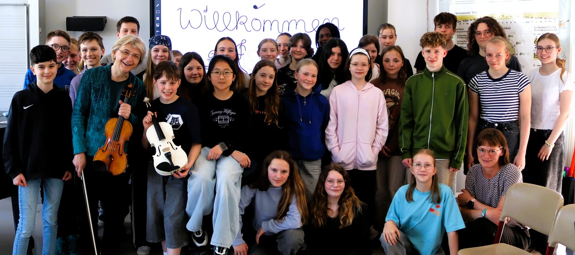 Am 17. April 2026 durften die Klasse 6a sowie einige Schülerinnen und Schüler unseres Schulorchesters die weltbekannte Geigerin Antje Weithaas zu einer exklusiven Musikstunde im Rahmen des Projekts "Rhapsody in School" begrüßen. Wir lauschten ihrer wundervollen Musik, lernten die Künstlerin ganz persönlich kennen und erfuhren Spannendes über die Geige und das Leben einer international gefragten Musikerin.