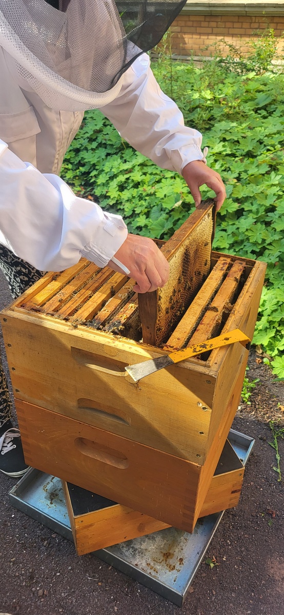 In der ersten Ferienwoche war Zeit für die Honigernte am ÖDG. Unter fachkundiger Anleitung von Herrn Förster und bei perfektem Wetter sorgten wir dafür, dass es im Sekretariat bald wieder Honig zu kaufen gibt.