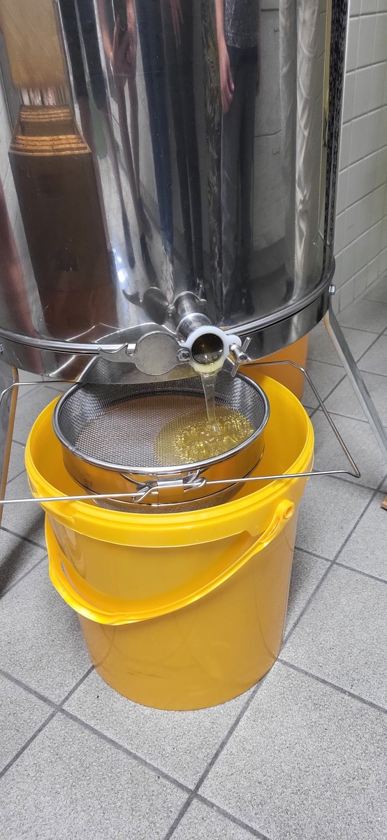 Dafür haben wir die Waben aus dem Volk genommen und entdeckelt, Honig geschleudert, gesiebt und abgefüllt und am Ende viel geputzt.