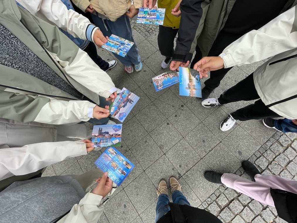 Am nächsten Morgen fuhren wir drei gemeinsam mit weiteren chinesischen Gastschülern, die bei meinen Freunden wohnten, mit der Straßenbahn zur Schule. Die ersten beiden Stunden nahmen die Gastschüler, wie auch an dem folgenden Tag, an unserem Unterricht teil. Meine Mitschüler waren interessiert und freuten sich sehr über den internationalen Austausch. Die restlichen Tage war ich, sowie alle Gastschüler und Gastgeberschüler, vom Unterricht befreit, denn wir erkundeten zusammen die Stadt, den Dom und den Landtag. Außerdem lernten die Gastschüler mit Füllfederhaltern die deutsche Schreibschrift kennen und konnten am Ende auf diese Art und Weise sogar eine Postkarte an ihre Familie schicken.