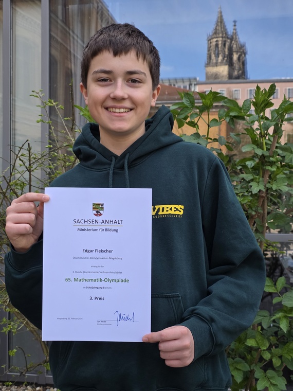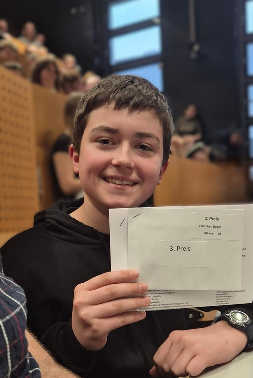Edgar Fleischer aus der Klasse 8a konnte bei der diesjährigen Landes-Mathematik-Olympiade wieder einen 3. Preis erringen.