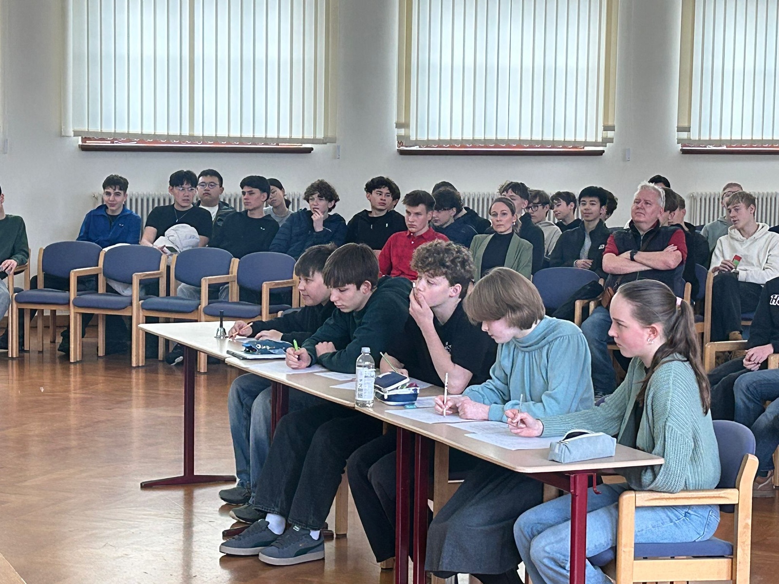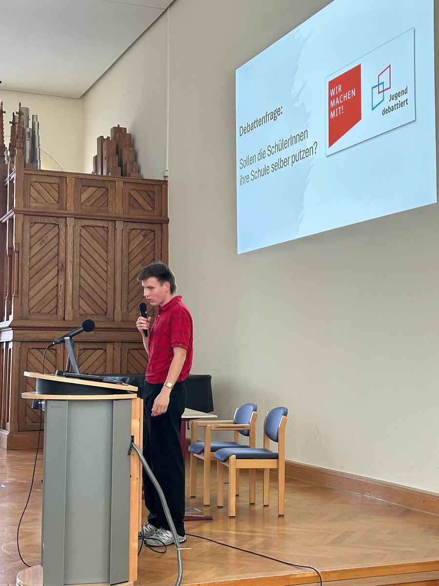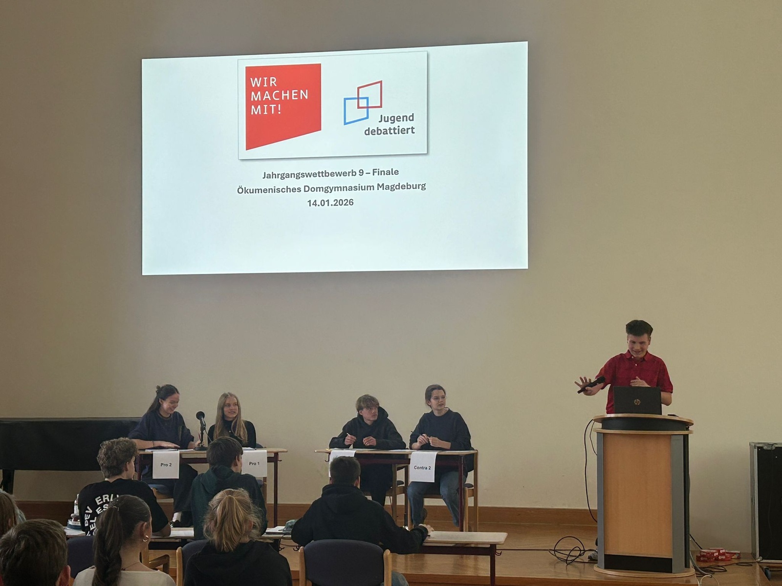 Hierbei wurden vielfältige und abwechslungsreiche Themen debattiert. In den vier Klassen fand zum Abschluss in mehreren Runden ein Klassenwettbewerb statt. Die vier Klassensieger debattierten am 14.01.26 im Finale vor dem gesamten Jahrgang in der Aula. Die Debattenfrage lautete: „Sollen die SchülerInnen ihre Schule selbst putzen?“