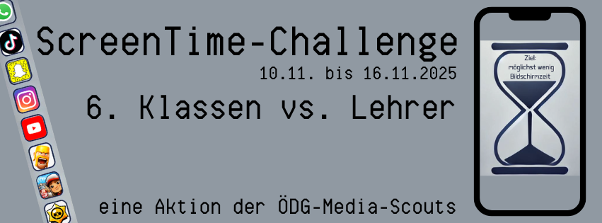 Die ÖDG Media-Scouts starten vom 10. bis 16. November 2025 den Handyfasten-Wettbewerb “ScreenTime-Challenge”. Ziel dieser Aktion ist es, unsere Schüler und Lehrkräfte zu motivieren, die Zeit am Smartphone bewusster zu nutzen und unnötige Bildschirmzeiten zu reduzieren. Bei diesem Wettbewerb treten die 6. Klassen untereinander und gegen das Lehrerkollegium an. Jede Klasse versucht dabei, als Gruppe möglichst wenig Zeit am Handy zu verbringen. Am Ende wird der Durchschnitt der Bildschirmzeit der gesamten Klassen untereinander und mit dem der Lehrkräfte verglichen. Wir sind gespannt, wer mehr Gefühl für das eigene digitale Wohlbefinden hat.