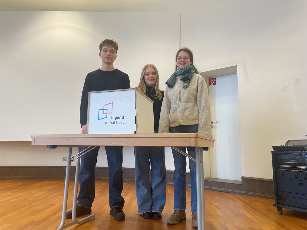 Nach interessanten Debatten zu Themen wie "Soll für Privatgärten eine insektenfreundliche Gestaltung vorgeschrieben werden?" oder "Soll zukünftig eine Kontaktgebühr für Arztbesuche erhoben werden?" konnten sich Kilian, Marlene und Charlotte (v.r.) gegen ihre Konkurrentinnen und Konkurrenten durchsetzen und werden nun unsere Schule im Landeswettbewerb am 13. April vertreten.