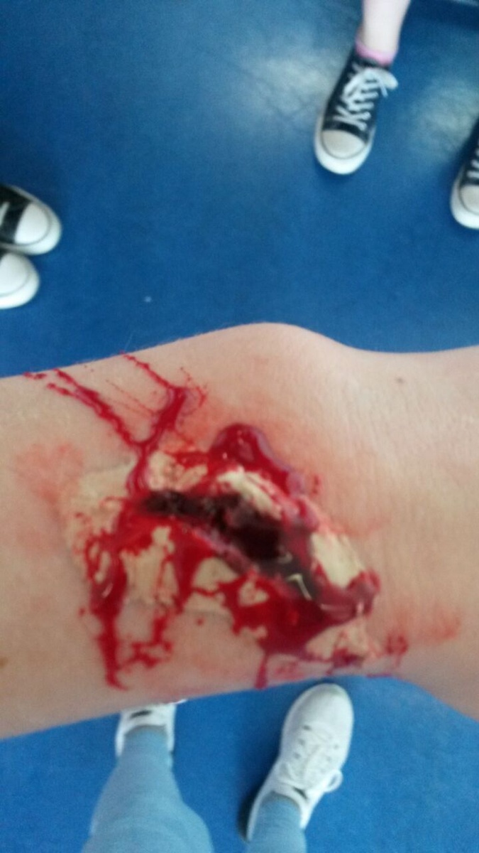 Als wir am Morgen zum Himmel sahen, freuten wir uns: strahlende Sonne und wenig Wolken. Nach einer kurzen, lustig anzusehenden Frühsporteinlage und gemeinsamen Spielchen wurden wir in verschiedene Gruppen eingeteilt. Schnell stand fest, wer wo war: Chemieraum, Physikkabinett, Hauswirtschaftsraum oder Schulhof? Typische Verletzungen für das jeweilige Fach wurden geschminkt, dargestellt und in vorbildlicher Erster Hilfe behandelt. Ein Glück, dass da niemand zugesehen hat. Trotz der Improvisation der spontan eingesprungenen Feuerwehr schmeckte das Mittagessen. Sie hatten sich nur ein wenig zu viel Beispiel am Feuer genommen.