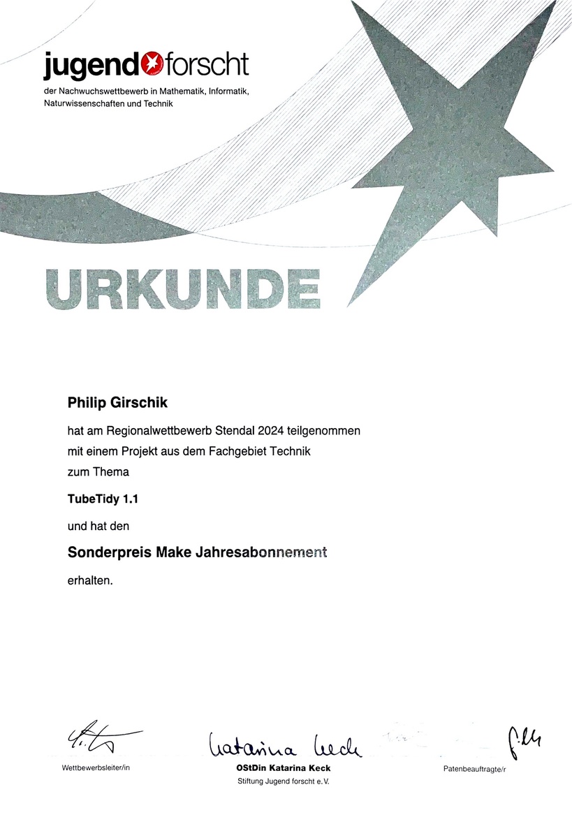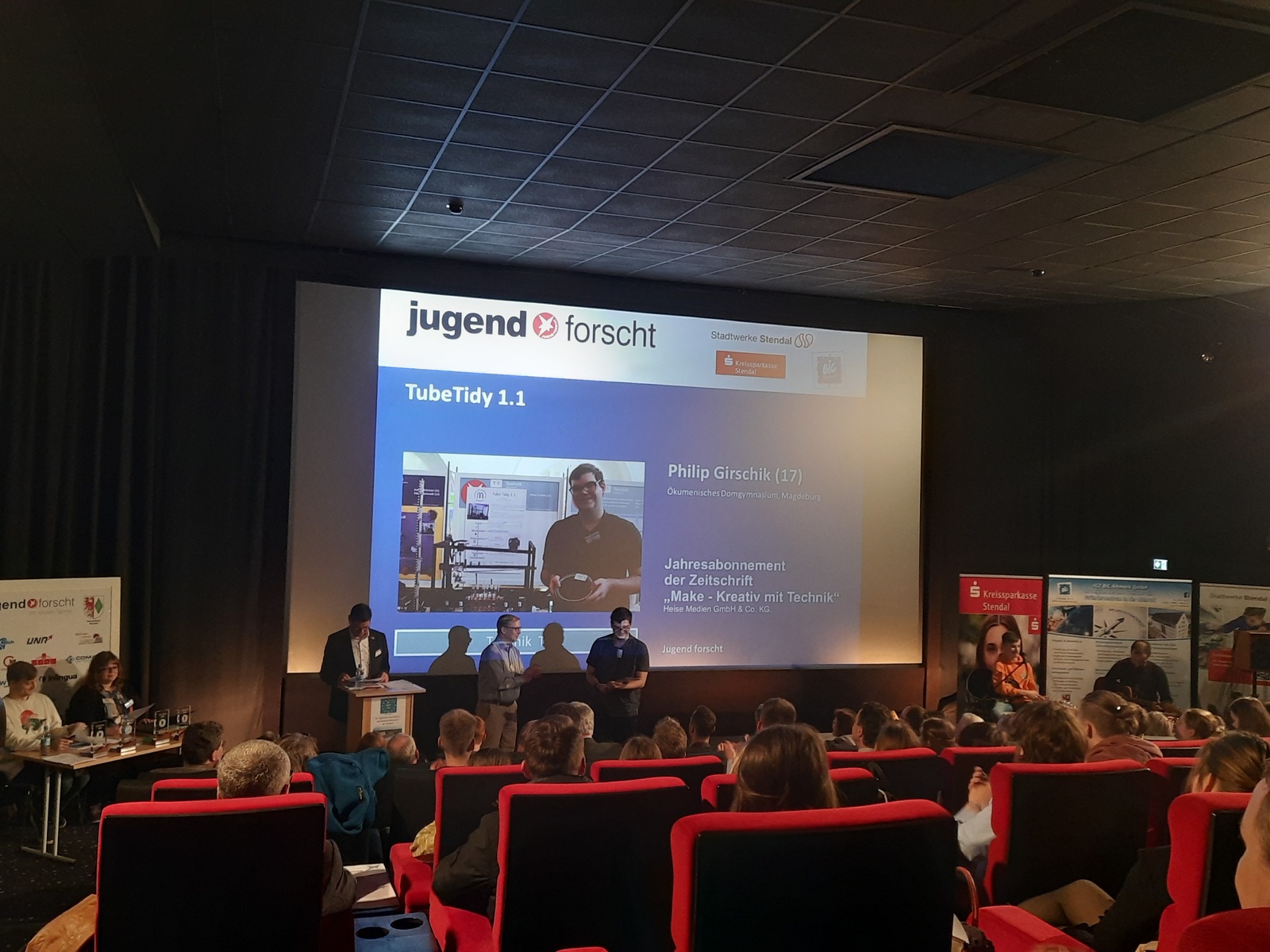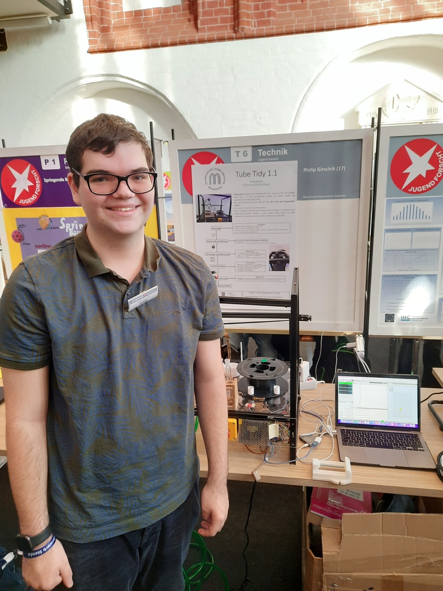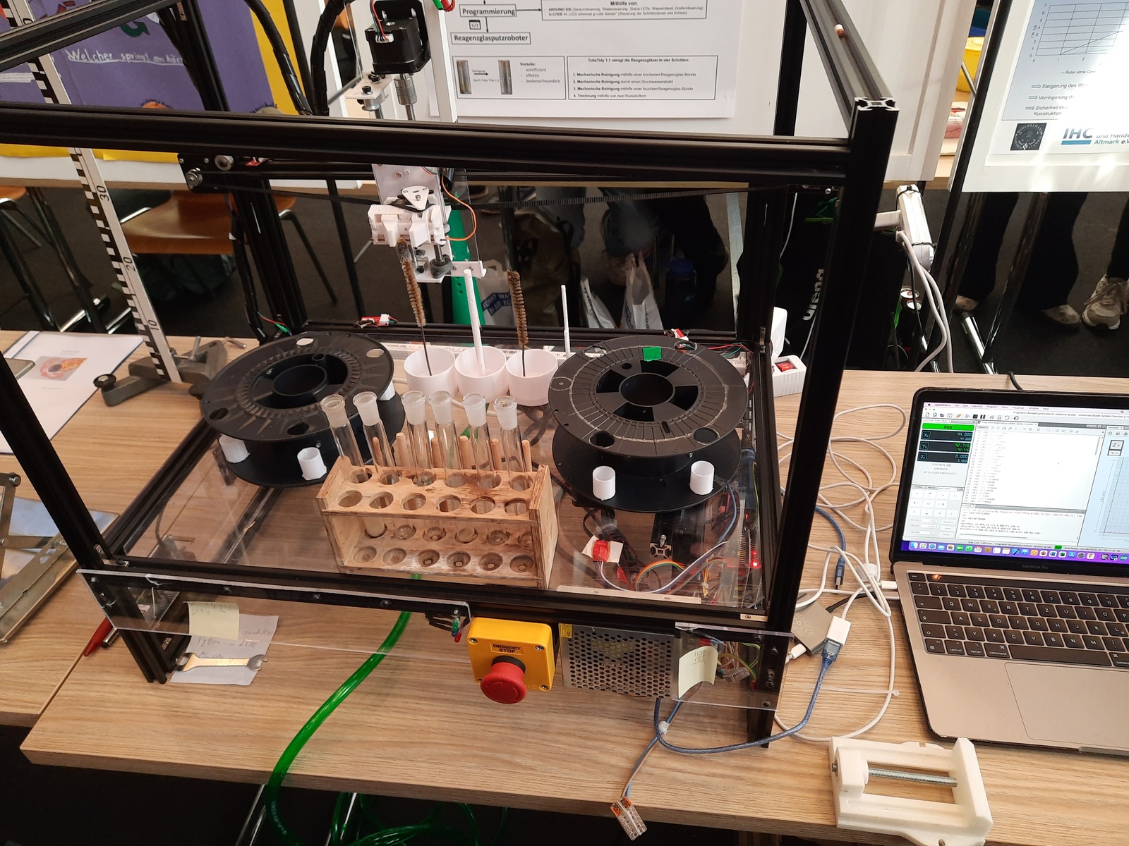 Über ein halbes Jahr hinweg hat Philip geplant, gebaut, geschraubt, gedruckt, programmiert und alle aufkommenden Probleme gelöst. Im Januar stellte er dann seine schriftliche Arbeit fertig und stellte am Donnerstag, den 29.02.2024 beim Regionalwettbewerb in Stendal sein Projekt vor. Während er der vierköpfigen Jury das Projekt erklärte, arbeitete der Roboter im Hintergrund fleißig weiter und reinigte Reagenzgläser.