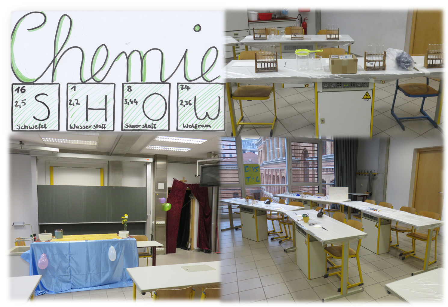 In dem anderen Chemieraum präsentieren die Mitglieder der Arbeitsgemeinschaft Chemie ihr Können. Jedes Jahr bereiten Sie unter Anleitung eine kleine Chemieshow vor, die das schauspielerische und experimentelle Geschick der Schüler zeigt.