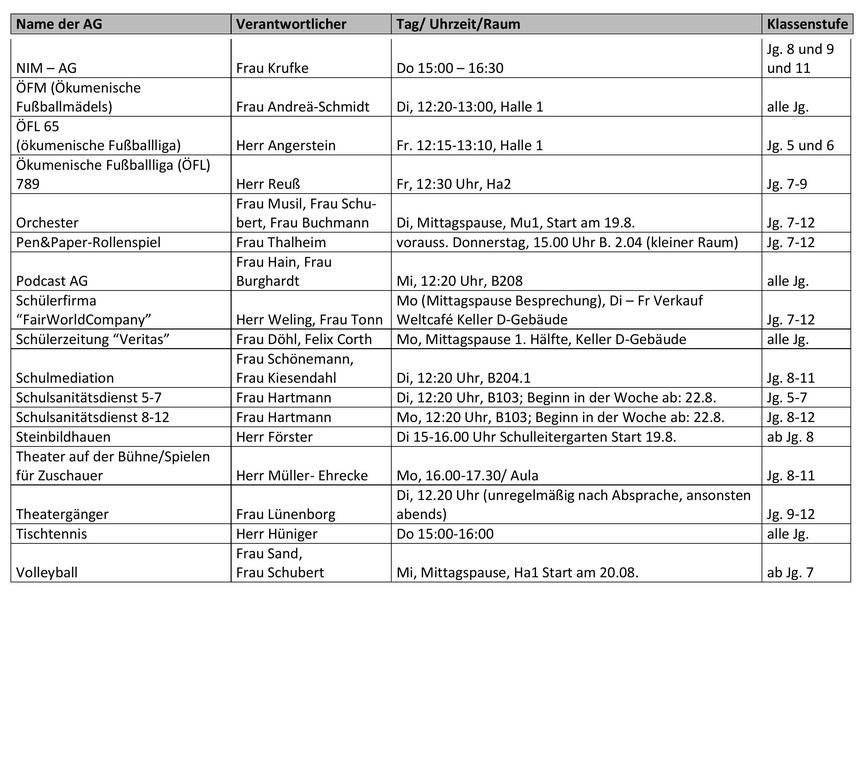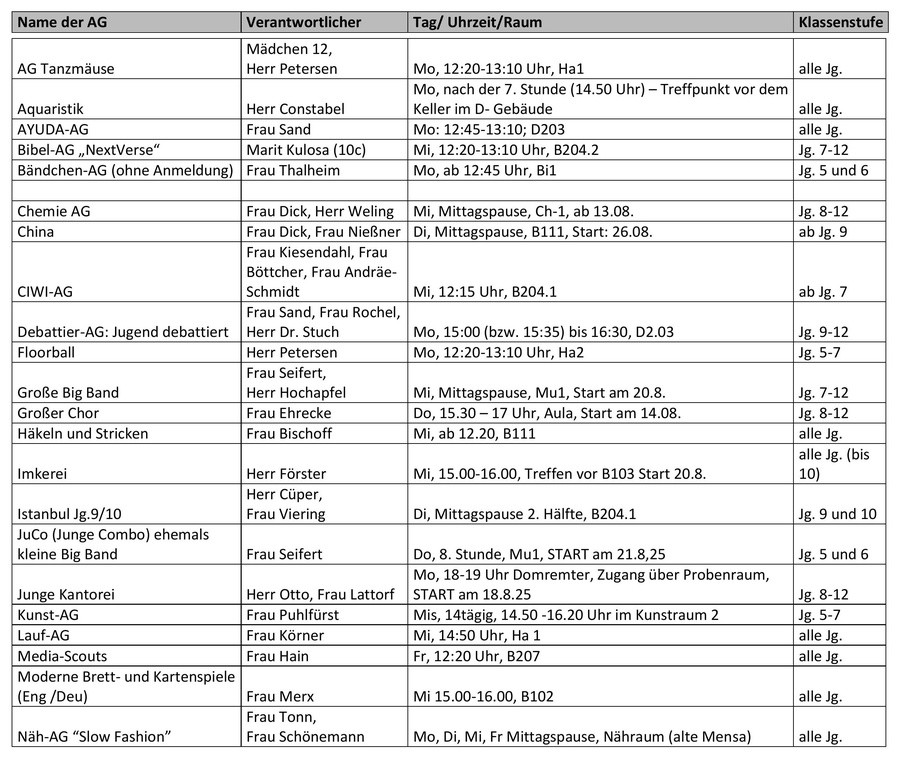 Die Überischt zu den Arbeitsgemeinschaften im Schuljahr 2025/2026 können Sie hier HERUNTERLADEN: AGs im Schuljahr 2025/26