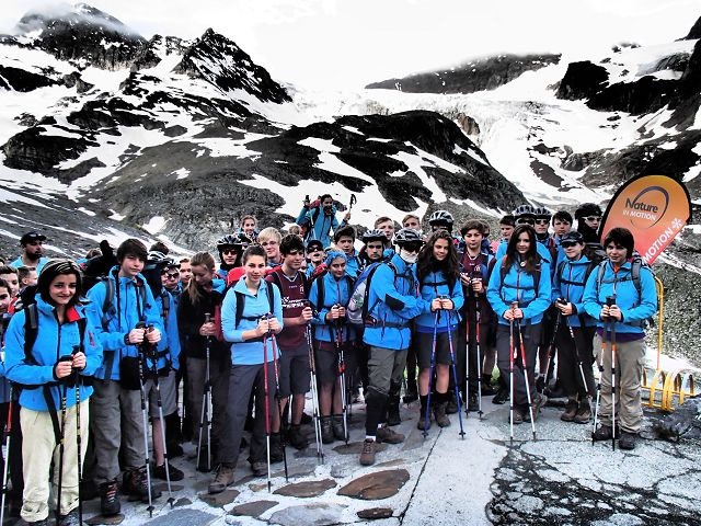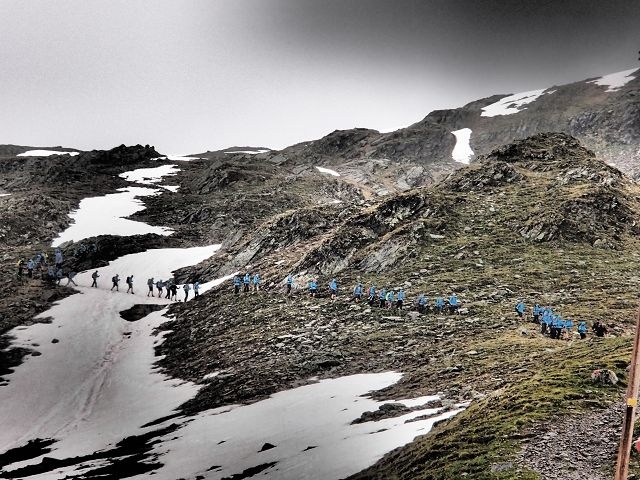 Heute war ein langer Tag für die Wanderer: um 8 Uhr ging es nach einem kurzen Fototermin mit dem Bus nach Galtür. Das zuerst sommerliche Wetter schwenkte bald in verschneite Berge um (AdR: frei nach Goethe: der Winter zog sich in rauhe Berge zurück). Einige steile Auf- und Abstiege sowie Bachquerungen brachten uns ins Schwitzen. Stunden später erwarteten alle nur noch die Hütte. Aber nach jedem Hügel, den wir überquerten und immer noch kein warmes Bett in Sicht war, schwanden Motivation und Glaube an die Planung der Lehrer langsam flöten (AdR: schöner Deutsch - das ist der Höhenkoller – die NIM Teamler wussten jederzeit wo es lang geht). Doch dann war endlich die Heilbronner Hütte zu sehen. So ging es auf den letzten Metern nochmal durch den Regen und schließlich ins warme Bettchen (AdR: Das Vier-Gänge-Menü scheint den Schülern nicht im Gedächtnis geblieben zu sein!)