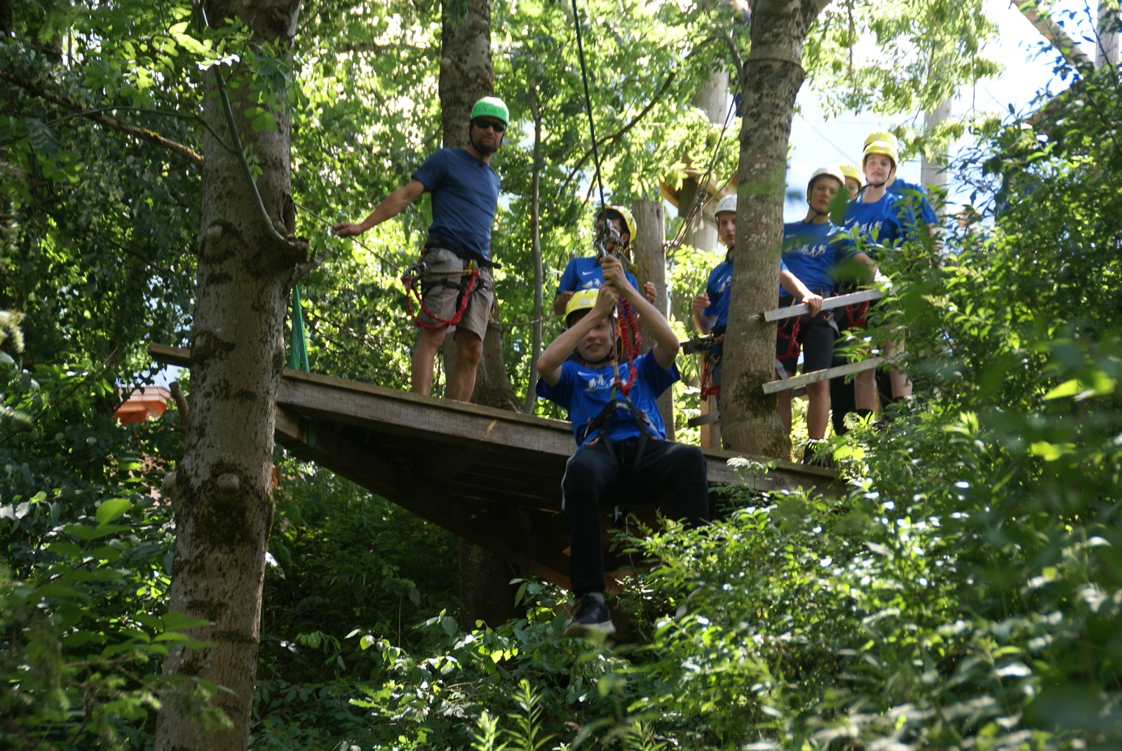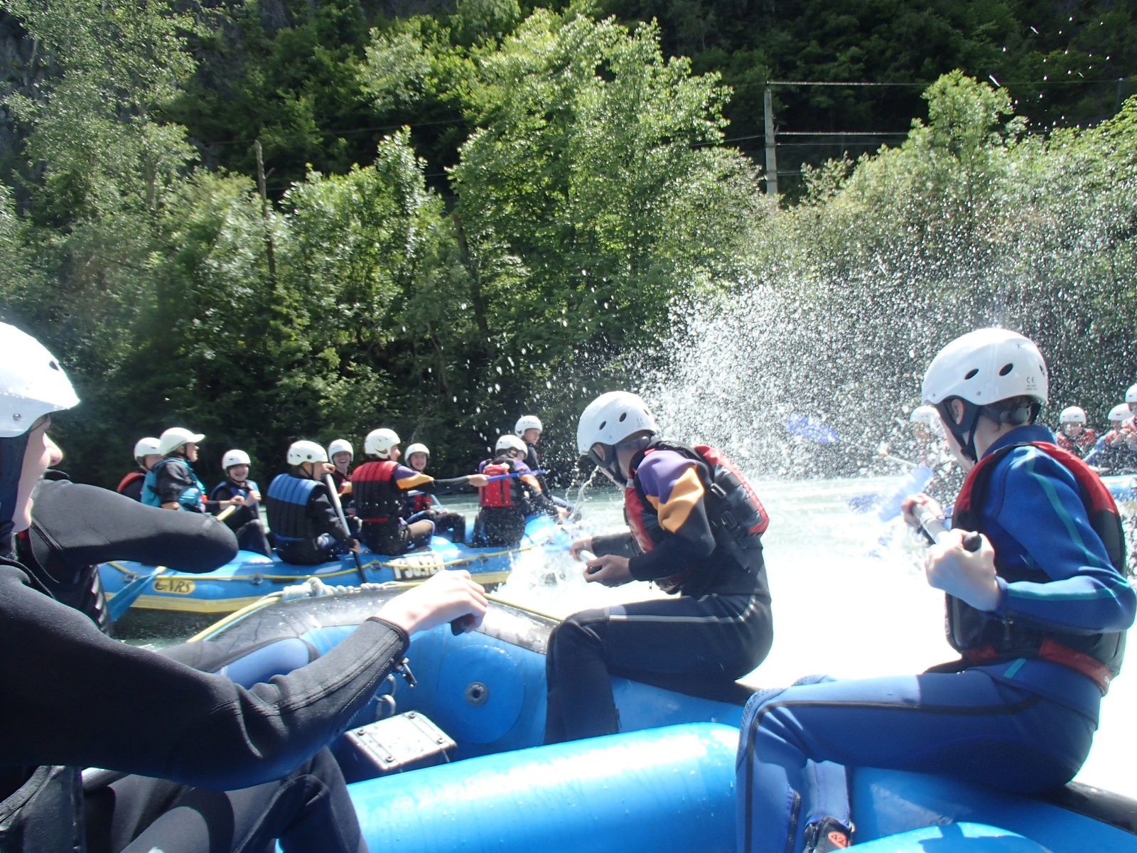 Unser Wassertag fing morgens schon mit viel Wasser an. In strahlendem Regen und guter Laune liefen wir matschige Wege, begleitet von Kühen (AdR: Habt ihr die Pferde, Ponys, Murmeltiere nicht gesehen?) ins Tal. Viele fuhren mit der Gondel ins Tal, manche nahmen jedoch den Weg über die spektakuläre Hängebrücke, von der man einen atemberaubenden Blick hatte. Unten im Tal stürmten dann alle Billa, um ihr letztes Geld für lebensnotwenige Snacks auszugeben. Am Nachmittag begann dann auch die Aktion, auf die sich alle von Anfang an freuten: Nachdem wir alle uns in unsere Neoprenanzüge reingequetscht hatten, fuhren wir zur Einstiegsstelle unserer Boote. Dabei versuchten wir normal zu atmen und nicht von Platzangst gepackt zu werden. Als es langsam vor Hitze unerträglich wurde, wurden wir wortwörtlich ins kalte Wasser geschubst. Mit tropfenden Anzügen stiegen wir alle freudestrahlend ins Boot. Wir fingen mit einfachen Kommandos an, wie vorwärts. Daraufhin folgte das allseits beliebte „Prost" bei dem wir unsere Köpfe ins Wasser tunkten. Nach vielen aufregenden Stromschnellen und lustigen Spielen stiegen wir überglücklich aus dem Wasser. Von da aus ging es ins wunderschöne 4* Hotel, in dem es abends endlich mal keine Nudeln gab.